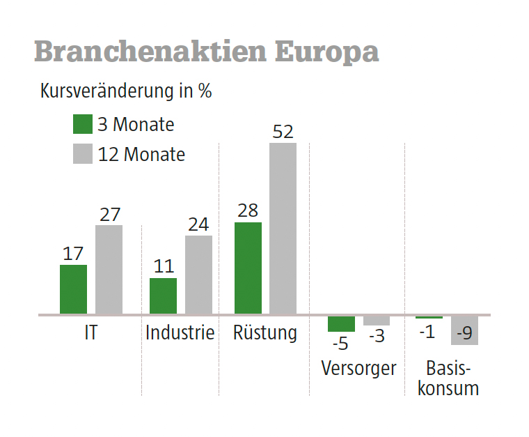 Die größte Kurssteigerung aller Subsektoren erzielte eine der ältesten Branchen: Die Waffenindustrie, modern gesprochen „Luftfahrt und Verteidigung“. Dieser Sektor erzielte in Europa in den ersten drei Monaten Zuwächse von fast 30 Prozent, während in den USA die Steigerungsraten nur im Durchschnittsbereich lagen. Rheinmetall war mit einem 3-Monats-Kursansteig von 80 Prozent Spitzenreiter im DAX 40, über die letzten 3 Jahre kletterte der Aktienwert um 516 Prozent nach oben. Andere Sektoren, die mit Luftfahrt ihr Geld verdienen, gehörten zum Gruppetto der Abgehängten: In Europa verloren die Teilsegmente Luftfracht und Fluggesellschaften etwa 10 Prozent, bei Schifffahrt waren die Verluste noch größer. Im Minusbereich war auch die Vierteljahres-Performance der Sektoren Immobilien sowie Basiskonsumgüter.