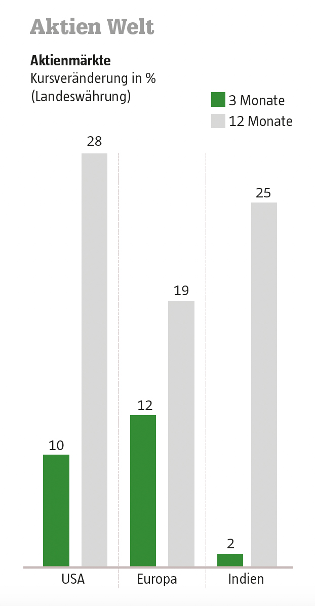 In Europa war das Kursprofil ähnlich, bei teilweise schwächerer Dynamik. Der Stoxx Europe 600 legte um 7 Prozent zu (in USD: 6%), das Verhältnis Gewinner zu Verlierer betrug nicht ganz 3:1. Der Blue Chip-Index der Eurozone, der Euro Stoxx 50, kletterte hingegen um 12 Prozent (USD: 11%) nach oben, hier kam auf vier Gewinner-Aktien eine Verlierer-Aktie. Die Steigerung des deutschen Leitindex lag mit über 10 Prozent etwas darunter, wohingegen der italienische Leitindex mit mehr als 14 Prozent deutlich überdurchschnittlich zulegte. Der britische Leitindex scherte ein wenig aus: Er verbesserte sich nur um 3 Prozent. In Japan verhielt sich der führende Index wie entfesselt: der Nikkei 225 steigerte sich im ersten Quartal um 21 Prozent. Ganz anders erging es dem Hongkong-Index Hang Seng. Nach Kursverlusten im Januar erholte er sich zwar, der Quartalszuwachs war aber mit 3 Prozent relativ schwach. Auch der indische Sensex steigerte sich in den ersten drei Monaten nur um 2 Prozent. Der brasilianische Bovespa verlor 3 Prozent, der mexikanische IPC blieb unverändert.