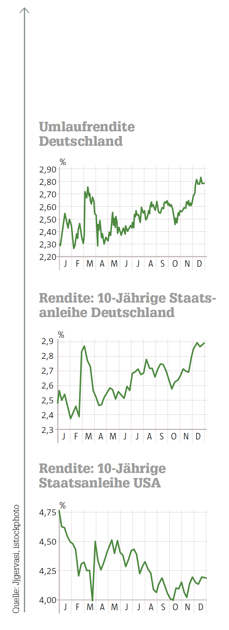 In den eben genannten Ländern mit Leitzinssenkungen rentierten kurzlaufende Staatsanleihen (z.B. 1-jährige) am Jahresende tiefer als am Jahresanfang. In Europa war das vor allem das Ergebnis fallender Renditen im ersten Quartal. In Japan stiegen diese Renditen. Bei Staatspapieren mit 10-jähriger Laufzeit war die 12-Monats-Differenz uneinheitlicher: Deren Renditen erhöhten sich in Jahresfrist in Deutschland um rund 22 Prozent, in der Schweiz um 12 Prozent, in UK gaben sie leicht nach, in den USA fielen sie um 8 Prozent.