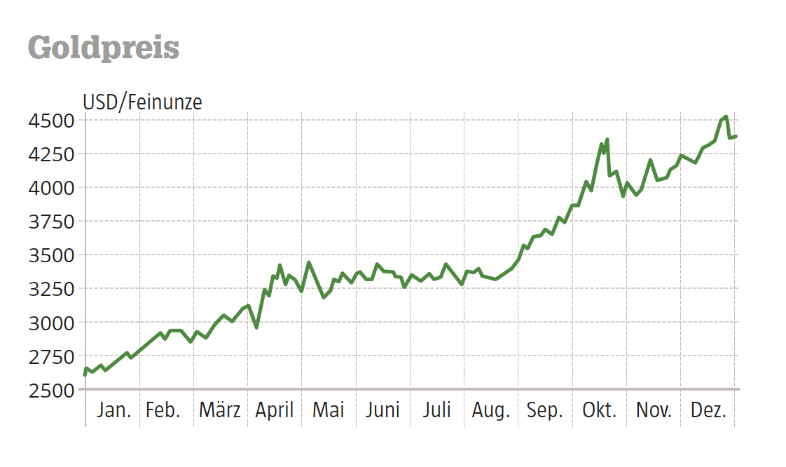 Der Goldpreis legte im Jahr 2025 in jedem Quartal zu – auch wenn er Ende Dezember nach einem fulminanten Höhenrekord von 4.550 USD etwas nachgab und das Jahr mit 4339 USD bzw. mit 3.669 Euro pro Feinunze beendete.