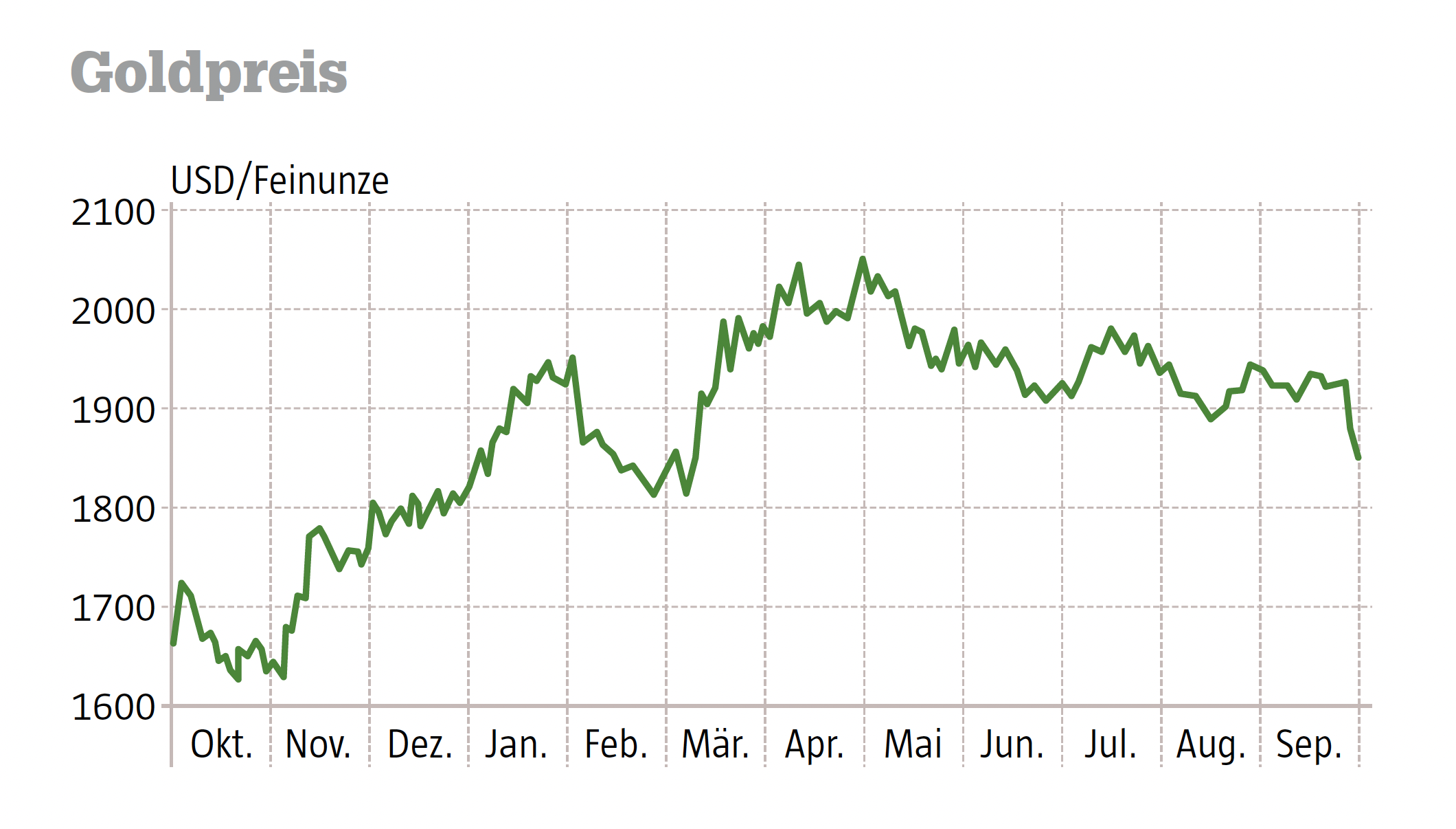 Der Goldpreis beendete das dritte Quartal im Minus: Ende Juni stand der Goldpreis bei 1971 USD (bzw. 1817 Euro), Ende des dritten Quartals war er bei 1848 USD (1749 Euro) angelangt. Damit setzte sich der Abwärtstrend fort, der im Mai dieses Jahres einsetzte, nachdem sich der Goldpreis zeitweise deutlich über der 2000-Dollar-Linie aufgehalten hatte. Seither konnte er nicht mehr in diese Regionen vorstoßen. Wie immer werden zur Erklärung der Goldpreis-Bewegungen die unterschiedlichsten Faktoren herangezogen. Ein Argument sind verstärkte Goldkäufe durch Zentralbanken im ersten Halbjahr, was, wenn das auch in Zukunft der Fall wäre, den Preis nach oben treiben würde. Auch konjunkturelle Schwächen der Goldnachfrage wurden schon erwogen, was den Preis nach unten drücken würde. Derzeit sind wieder einmal veränderte Zinserwartungen Diskussionsstoff.