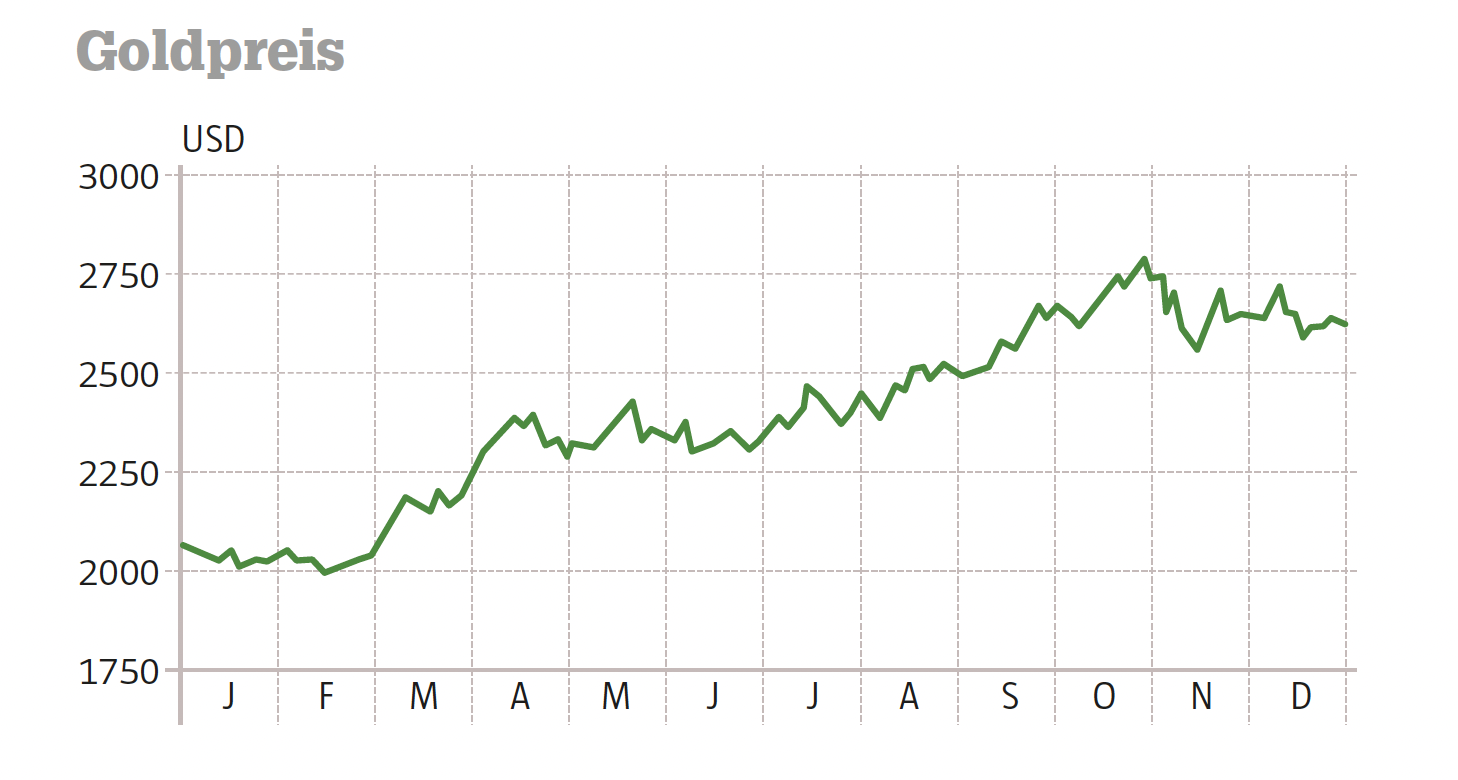 Der Goldpreis war mit 2.062 USD ins Jahr 2024 gestartet. Am 31. Oktober erreichte er mit 2.790 USD sein bisheriges Allzeithoch auf Dollar-Basis. Das waren 35 Prozent mehr als die Feinunze Gold zu Jahresbeginn kostete. Am Ende des Jahres 2024 stand der Goldpreis bei 2.625 USD, woraus sich ein Jahreszuwachs von 27 Prozent ergibt.