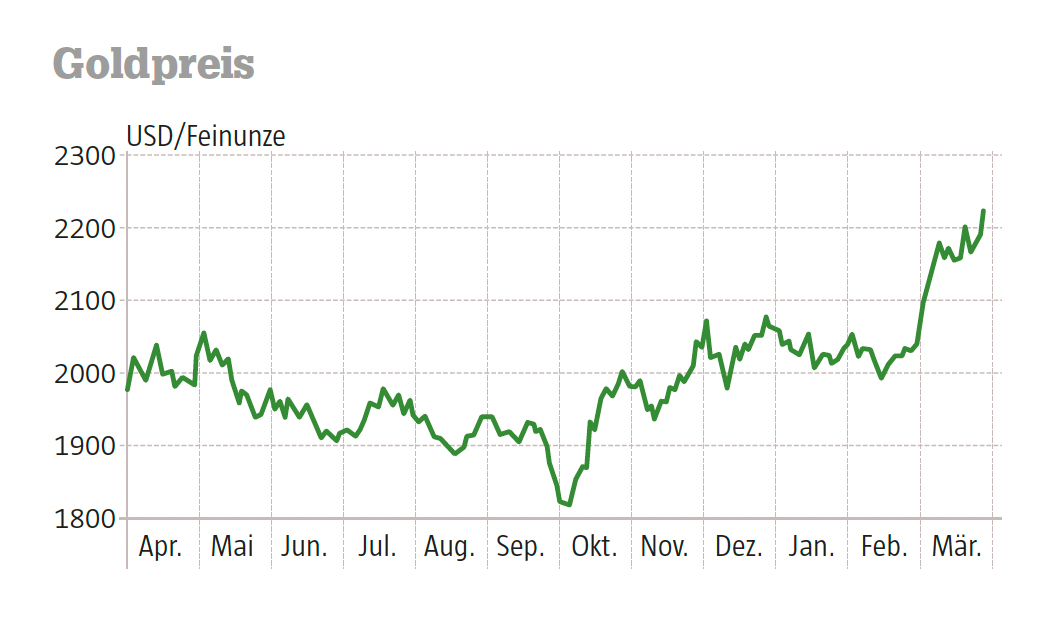 Zunächst startete das Edelmetall jedoch unauffällig ins Jahr: Sein Preis bewegte sich seitwärts bis leicht nach unten. Ende Februar und Anfang März machte der Gold-Kurs dann einen außergewöhnlich kräftigen Sprung nach oben. Am 20. März kletterte er erstmals über 2200 US-Dollar. Ende März war der Goldpreis schließlich bei 2233 USD angelangt, einem neuen Allzeithoch, und damit rund 8 Prozent teurer als zu Beginn des Jahres 2024. In Euro-Notierung hat sich Gold um 10 Prozent auf 2072 Euro verteuert.