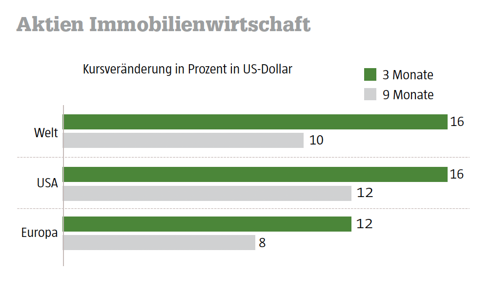 Im S&P 500 übertraf der Teilindex für Immobilienaktien mit einem Quartalsplus von 16 Prozent den Mutterindex deutlich. Der Immobiliensektor im Euro Stoxx 50 steigerte sich im Quartal in Dollar-Notierung um über 20 Prozent und im Stoxx Europe 600 um 17 Prozent. Trotz dieser Zuwächse reichen die Kurssteigerungen seit Jahresanfang allenfalls für das Mittelfeld.