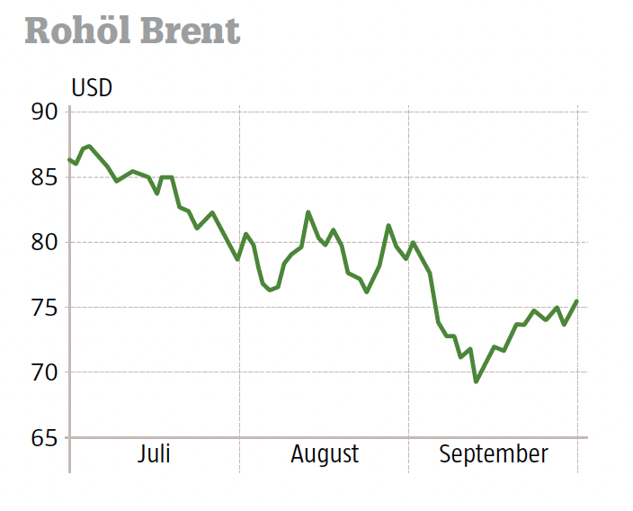 Bei Agrarrohstoffen ist die Entwicklung naturgemäß uneinheitlich. Über das gesamte dritte Quartal betrachtet stiegen die Preise für Baumwolle, Hafer, Holz, Kaffee oder Mais. Gefallen sind sie bei Mastrind oder Sojabohnen. In der Summe führten die verschiedenen Preismuster im Agrarrohstoffindex von G&P zu einem Kursanstieg. Erdöl verbilligte sich im Quartal um rund 14 Prozent. Die Nordsee-Sorte Brent kostet Anfang Juli 85 USD, Ende September 72 USD. Konjunkturforscher erklären das mit verringerter Nachfrage und erhöhtem Angebot, raten aber davon ab, daraus einen Trend abzuleiten, zumal geopolitischen Unsicherheitsfaktoren weiterhin für hohe Volatilität sprechen.