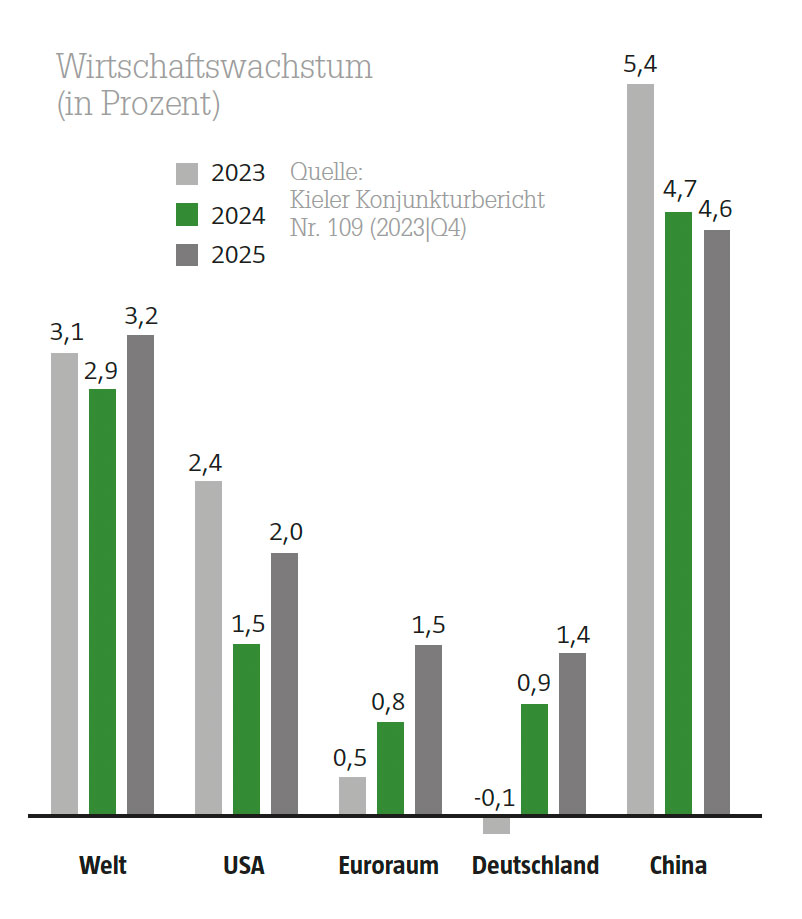 Die Weltwirtschaft wuchs im Jahr 2023 mit 3,1 Prozent (Angabe: Kiel Institut für Weltwirtschaft, IfW) stärker als Experten prognostiziert hatten (2,2%, IfW, 2022). Ein wichtiger Grund hierfür war, dass die US-Wirtschaft nicht wie vorhergesagt schrumpfte, sondern um 2,4 Prozent expandierte. Auch etliche andere entwickelte Volkswirtschaften – z.B. Japan, Großbritannien, Australien oder Norwegen – wuchsen stärker als erwartet. Im Schwellenländerbereich übertrafen Lateinamerika als Region, China oder auch Russland die Prognosen. Anders im Euroraum: Hier bestätigte die Wirklichkeit mit einem BIP-Zuwachs von 0,5 Prozent die Voraussagen der Experten. Das galt auch für Deutschland, das mit einem Negativwachstum von -0,1 Prozent (aktuelle IfW-Berechnung) im Rahmen des Erwarteten blieb. Für 2024 sagen die Konjunkturexperten des IfW ein etwas gedämpfteres Wachstum der Weltwirtschaft voraus, wobei der Euroraum und Deutschland stärker wachsen sollen als 2023.