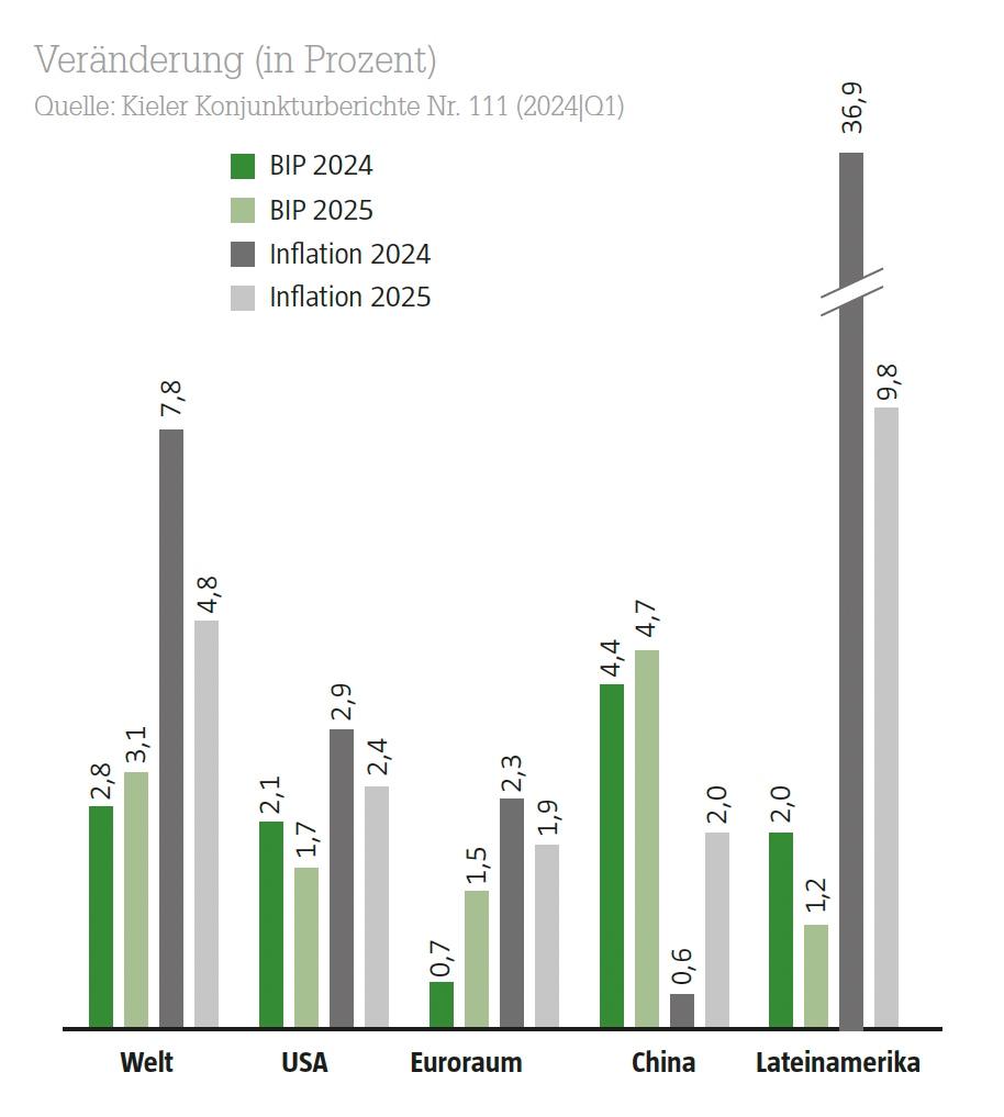 In Japan war das Wachstum in jüngerer Vergangenheit ebenfalls bescheiden. In Schwellenländern expandierte die Wirtschaft zuletzt zwar wie üblich stärker, sie blieb aber gegenüber früheren und erwünschten Wachstumsraten zurück. Die Konjunkturexperten des IfW rechnen in ihrer Prognose vom März damit, dass sich die globalen Wachstumsunterschiede im Jahrverlauf 2024 verringern werden.